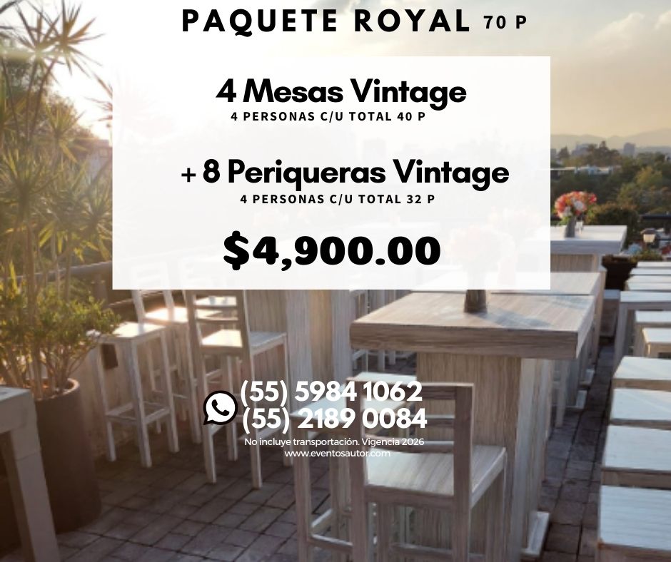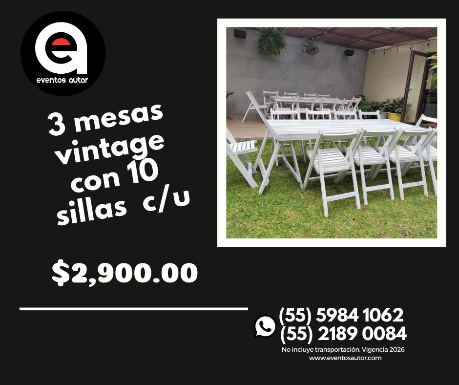 Paquete Mesas Vintage: De 03 mesas vintage con 10 sillas cada una desde $2,400 pesos.